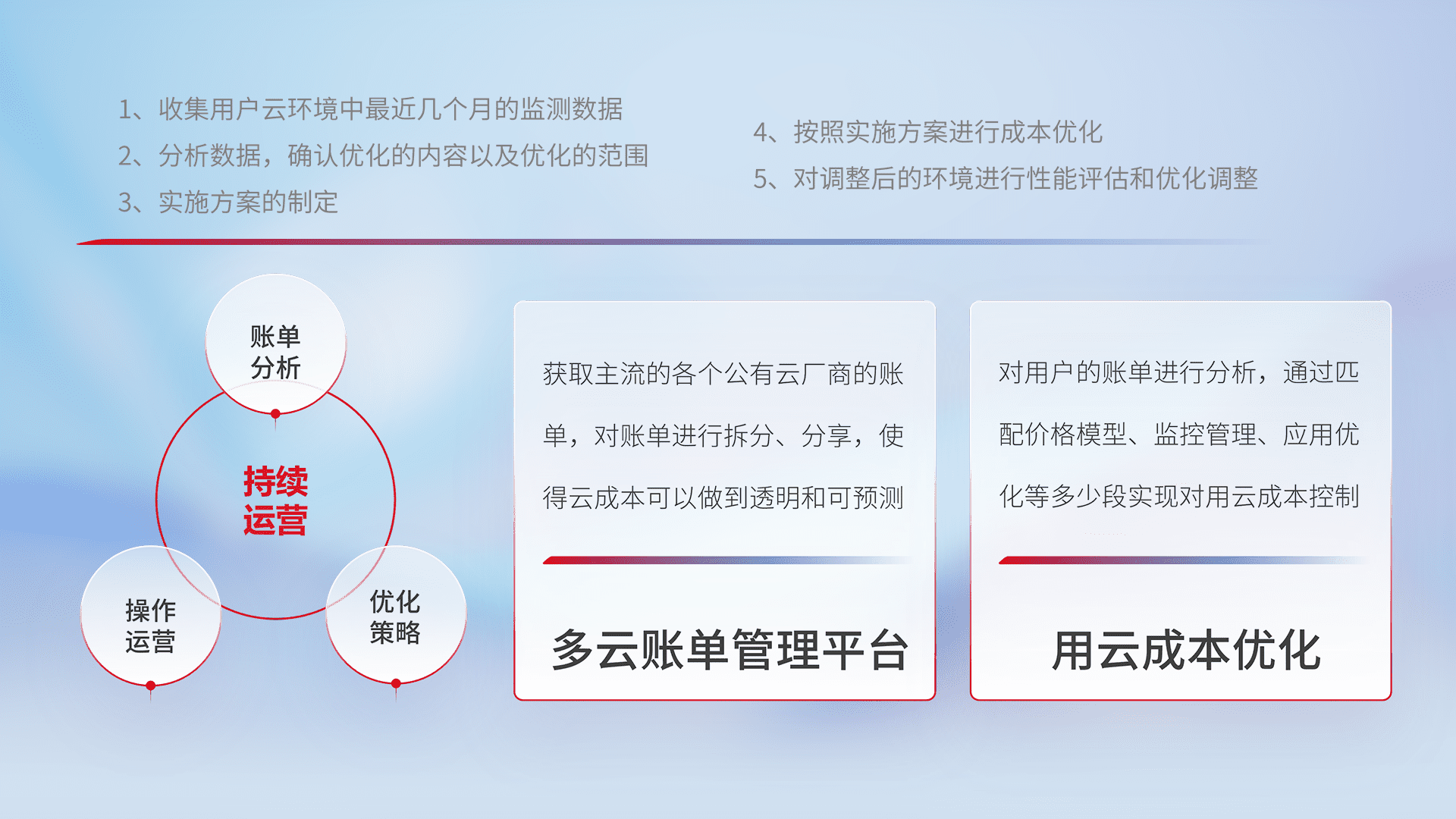 通过多云纳管,,,以统一的资源数据模型把客户的云资源进行抽象和封装,,进而实现对多云资源的统一操作,,,保障云资源管理的可靠性、、、、稳定性与可用性。。。。量身定制化运维内容,,,配置、、开发运维、、、补丁管理、、备份、、、监控、、认证和访问管理、、、审计和日常巡检等,,,,保障在用云过程中的可靠度,,稳定度以及高可用率。。。。