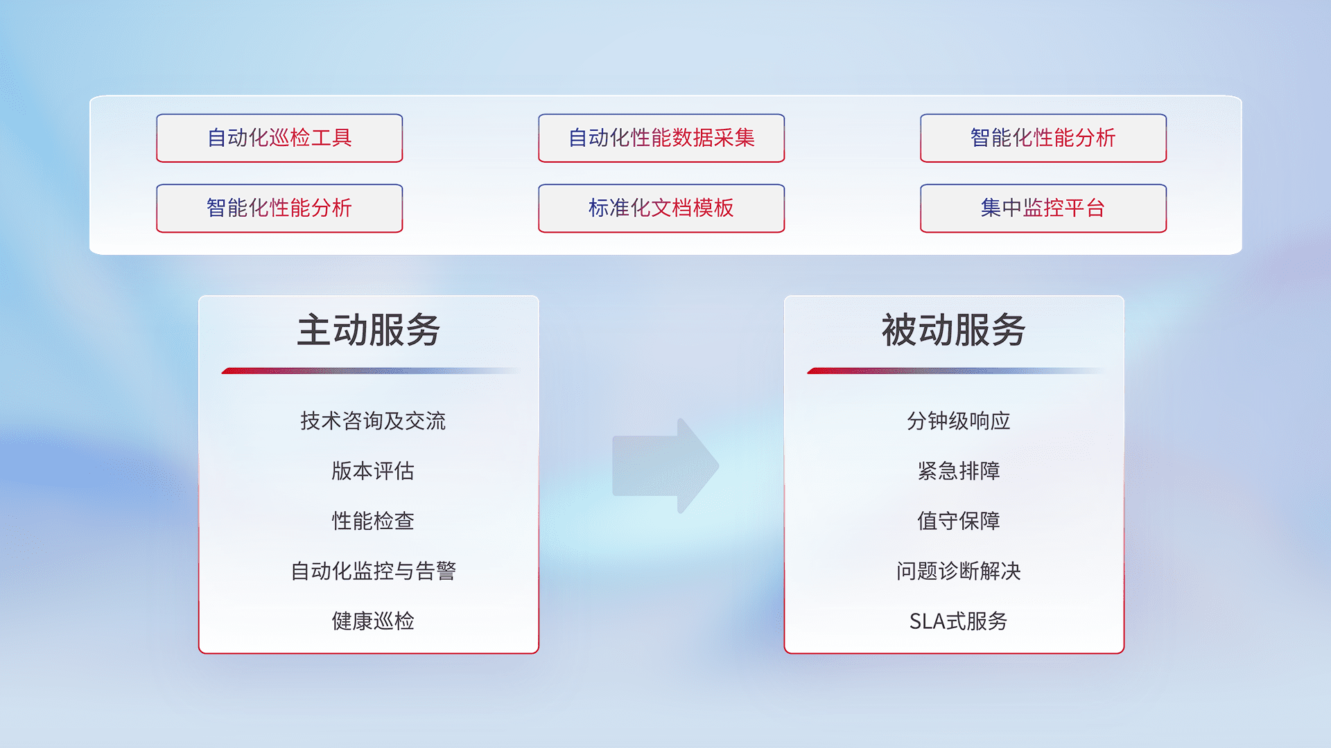 智能化工具和标准化文档,,,,保障服务质量,,,,提供主动服务(包含技术咨询、、、版本评估、、性能检查、、、、自动化监控与告警、、、健康巡检)和被动服务包含(分钟级响应、、、、紧急排障、、值守保障、、问题诊断解决、、SLA服务)。。。
